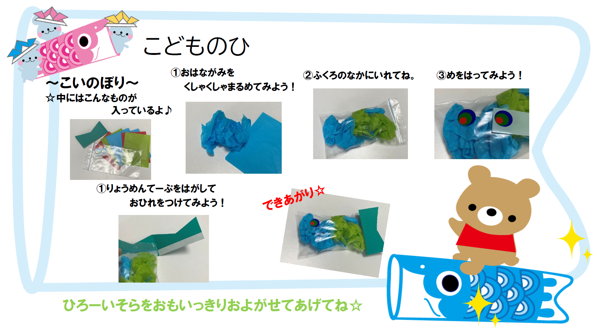 先日の「おたのしみボックス」では、こどもの日に合わせてこいのぼりの制作キットを用意しました!