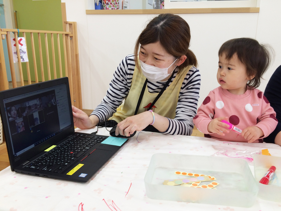 オンライン保育の良いところは、パソコンなどの通信機器があれば、お互いが離れていても、瞬時に画面越しにお友だちと会うことが出来る点。