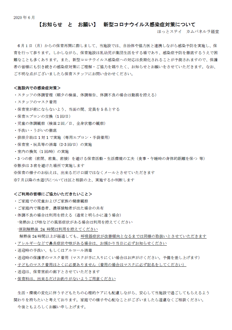 2020年6 月1日(月)からの保育再開に際しまして、自治体や協力医と連携しながら感染予防を実施し、保育を行っておりますが、新型コロナウイルス感染症への対応は長期化されることが予測されます。