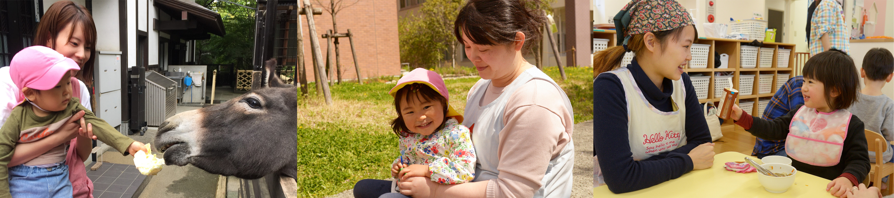 屋内での遊びや食育活動はもちろん、天気の良い日には屋外へお散歩に出かけ、自然や、時には生き物とも触れ合うことで生命の大切さも学びます。