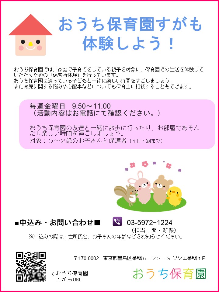 おうち保育園すがもでは、家庭で子育てをしている方を対象に、保育園での生活を体験していただくための「保育園体験」を行っています。