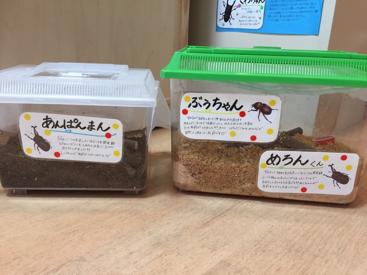 早速名前を考えてくれ、雌は「ぶう」、雄は「めろん」と「アンパンマン」になりました。発想豊かな子ども達が一生懸命考えてくれた素敵な名前です。これから成虫になる2匹はどんな名前になるのかな。