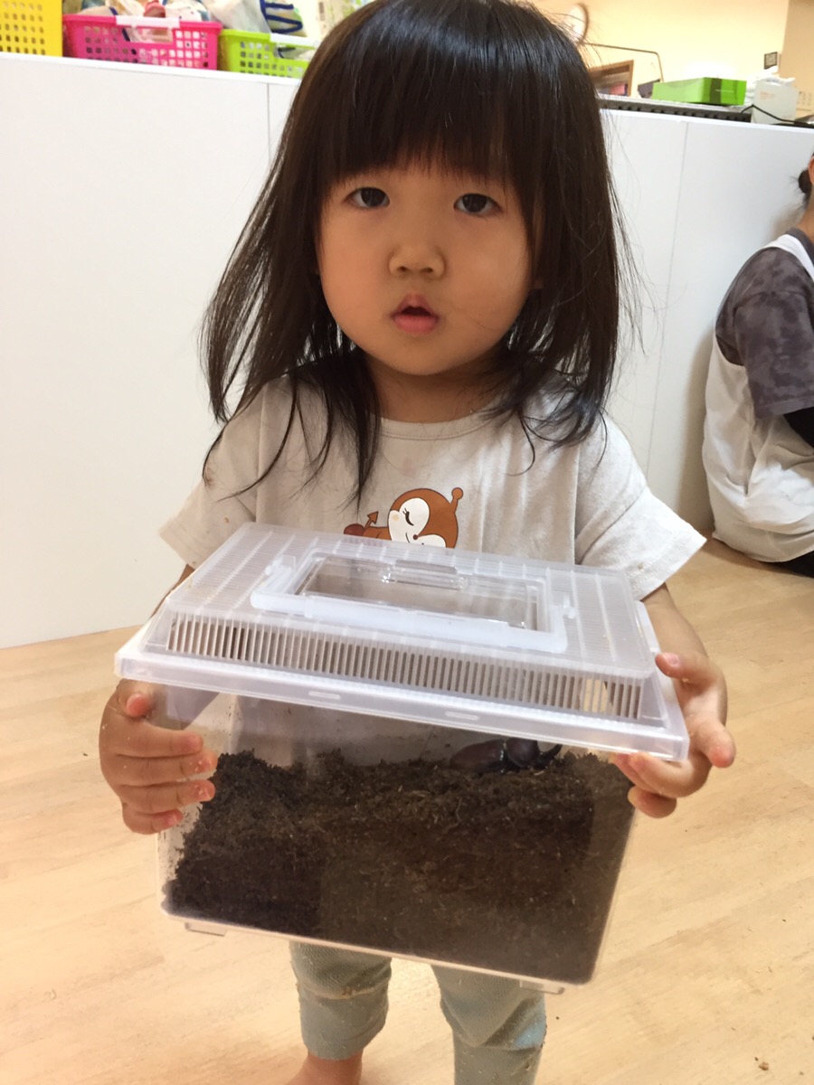 成虫になったカブトムシを見た子ども達は、目をキラキラさせて喜んでいます。