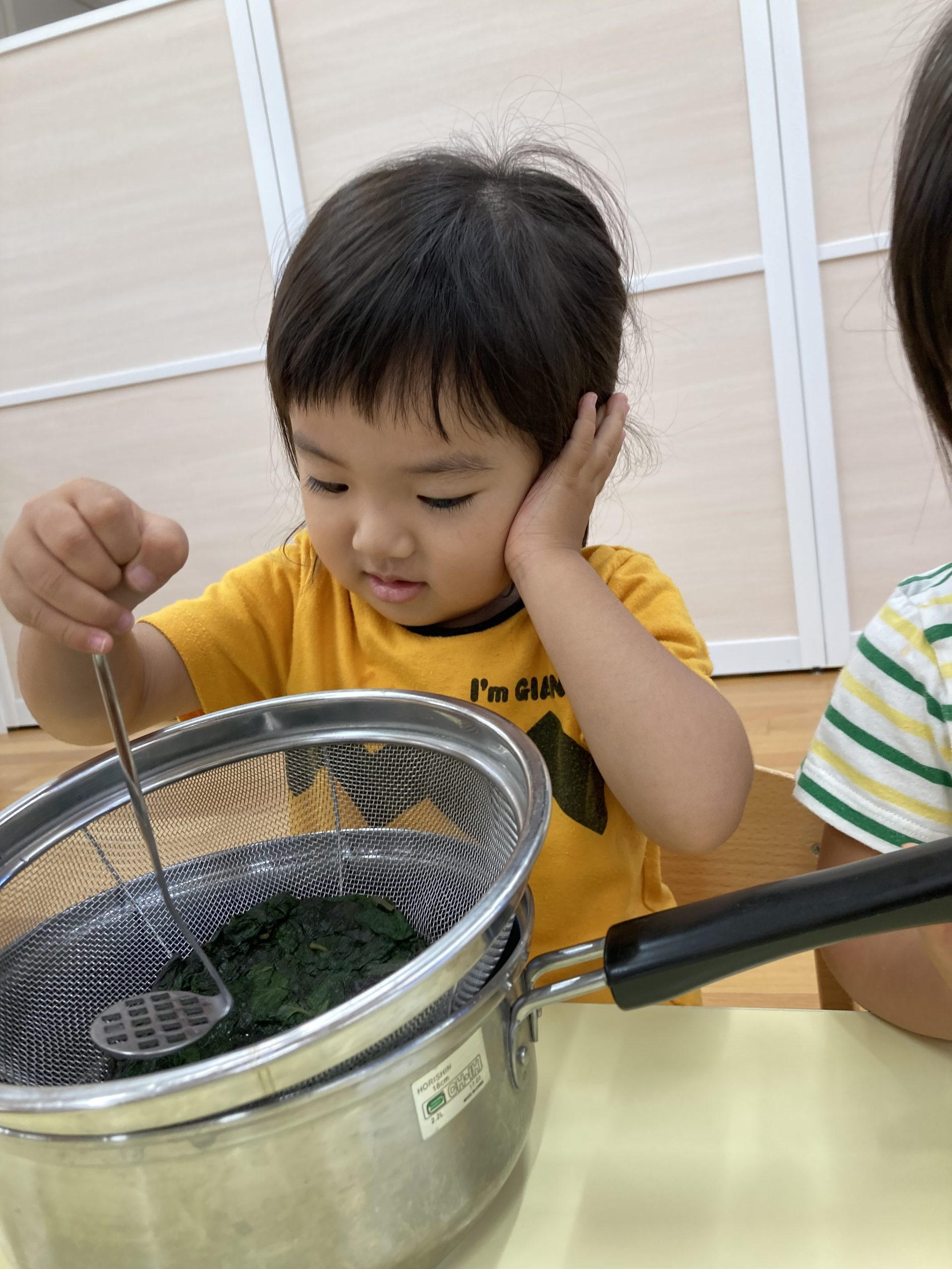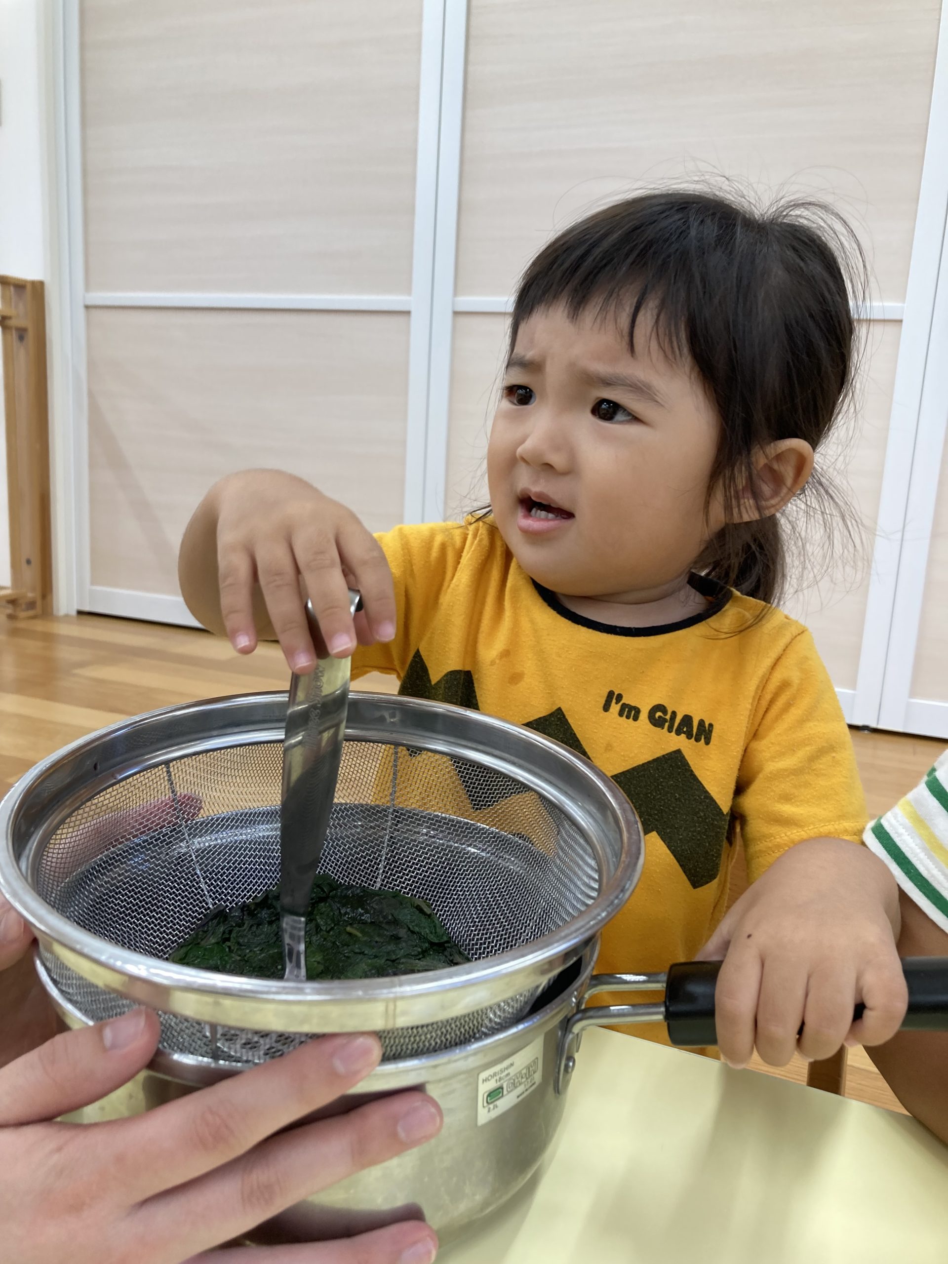 そうこうしている間に、冷めたしそを使ってのジュース作りです。茹でたしその葉をザルにおいて、それをマッシャーでこします。2歳児は8人いて、みんながやりたいので「10回ずつ交換しよう!」と話し、先生が数を数えて10になったら交代です。
