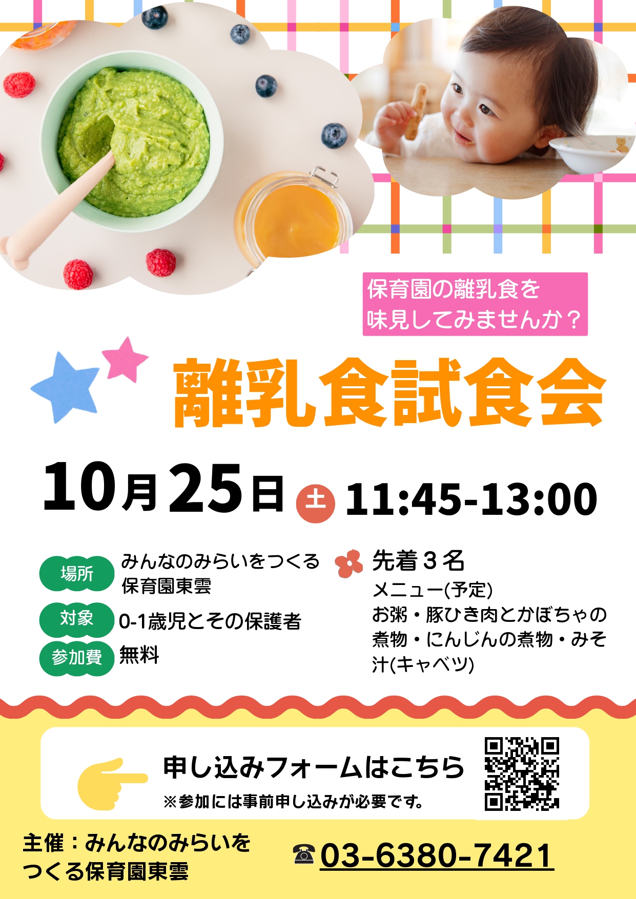 みんなのみらいをつくる保育園東雲では、0-1歳児のお子さん向けに、離乳食の試食会を実施します。 ぜひ遊びに来てくださいね!