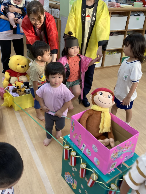 そしていよいよ夕涼み会当日。園の空間には、こどもたちと作り上げたおばけ屋敷が賑やかに構えていました。オープニングでは、こどもたちがみんなでお神輿を引っ張って登場し、その生き生きとした姿に大きな歓声が上がりました。