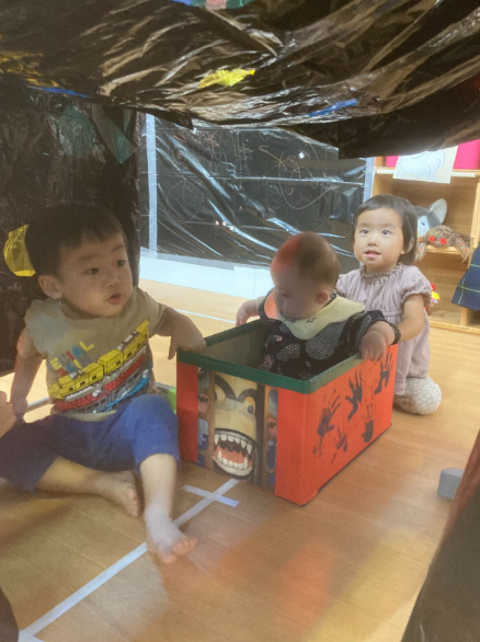 園に戻ってからも、こどもたちの口からは何度もこの言葉が聞かれました。彼らの心に強く焼き付いた体験の熱を冷まさないよう、その後もたびたび動画で振り返ることにしました。1歳児のこどもたちも、2歳児のお兄さんお姉さんの興奮した様子につられて、画面に釘付けになる日々。やがて、そこから流れる「スリラーカー」という言葉は、園全体の共通言語となっていきました。さらにこどもたちは、ミイラ男や鬼など、お化け屋敷の細かな仕掛けにまで興味を持つようになり、そこでの気づきを自分たちがつくるお化け屋敷に取り入れることになったのです。