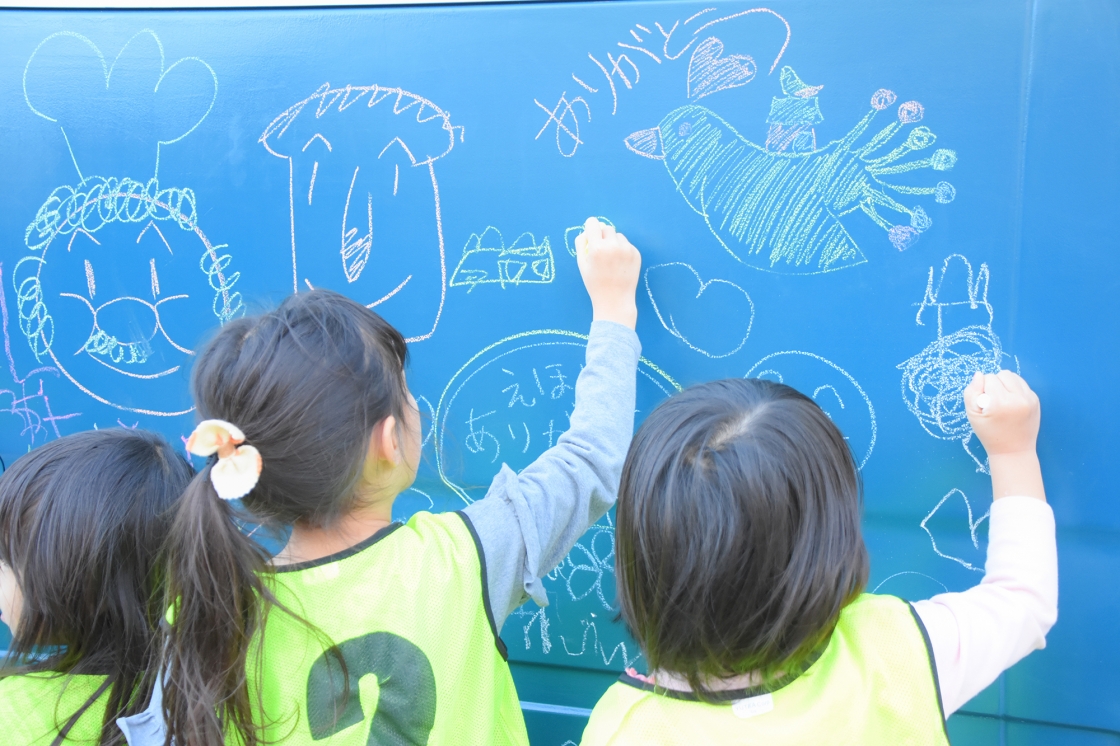 待っている子や選び終わった子は、なんとチョークで書けるバスに絵を描いていきます。