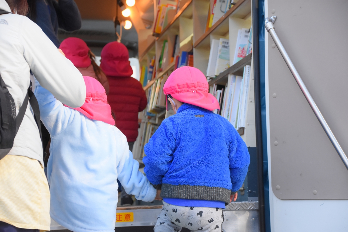 入れ代わり立ち代わり、本を選びにバスに入っていく子どもたち。車好きの子どもはバスに乗れるだけでも大喜びです。