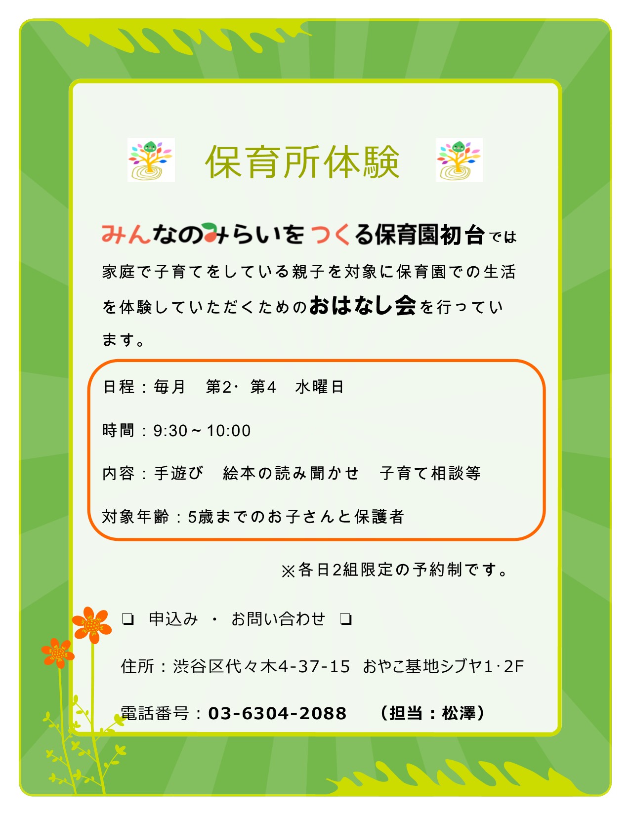 みんなのみらいをつくる保育園初台では、家庭で子育てをしている親子を対象に保育園での生活を体験していただくための「おはなし会」を行っています。
