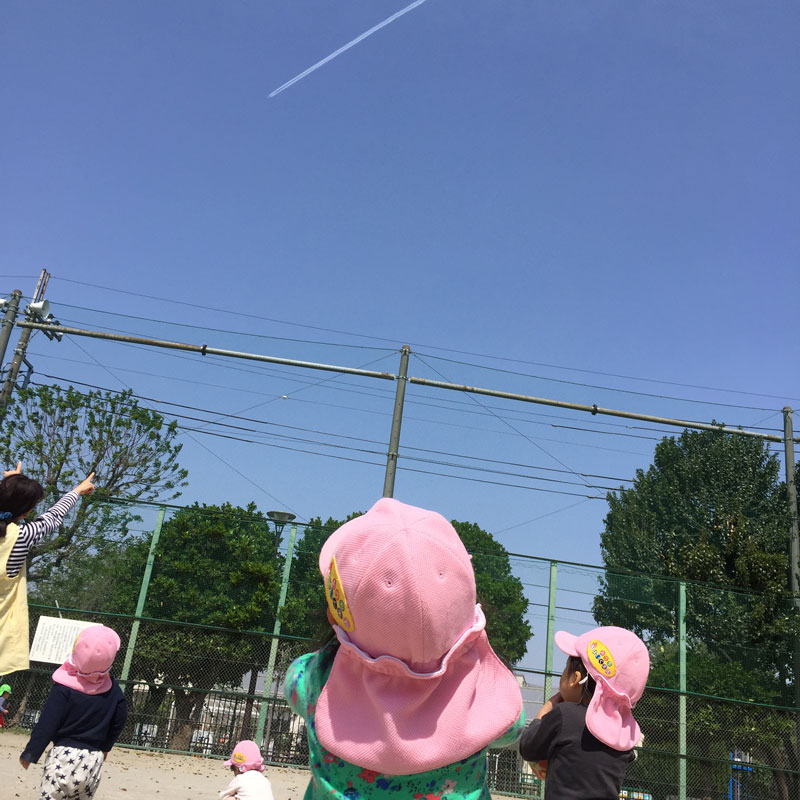 園児が空を見上げている写真