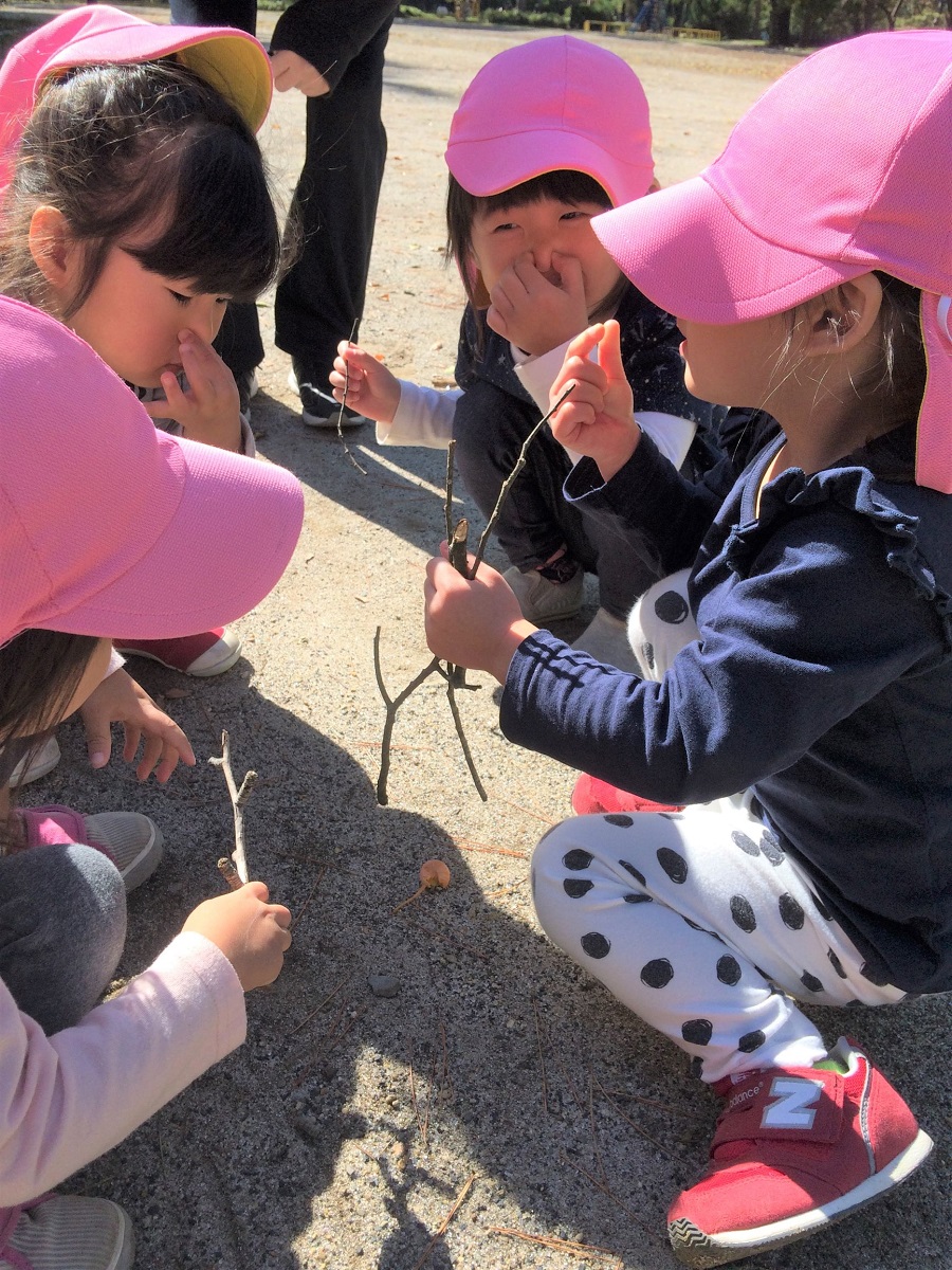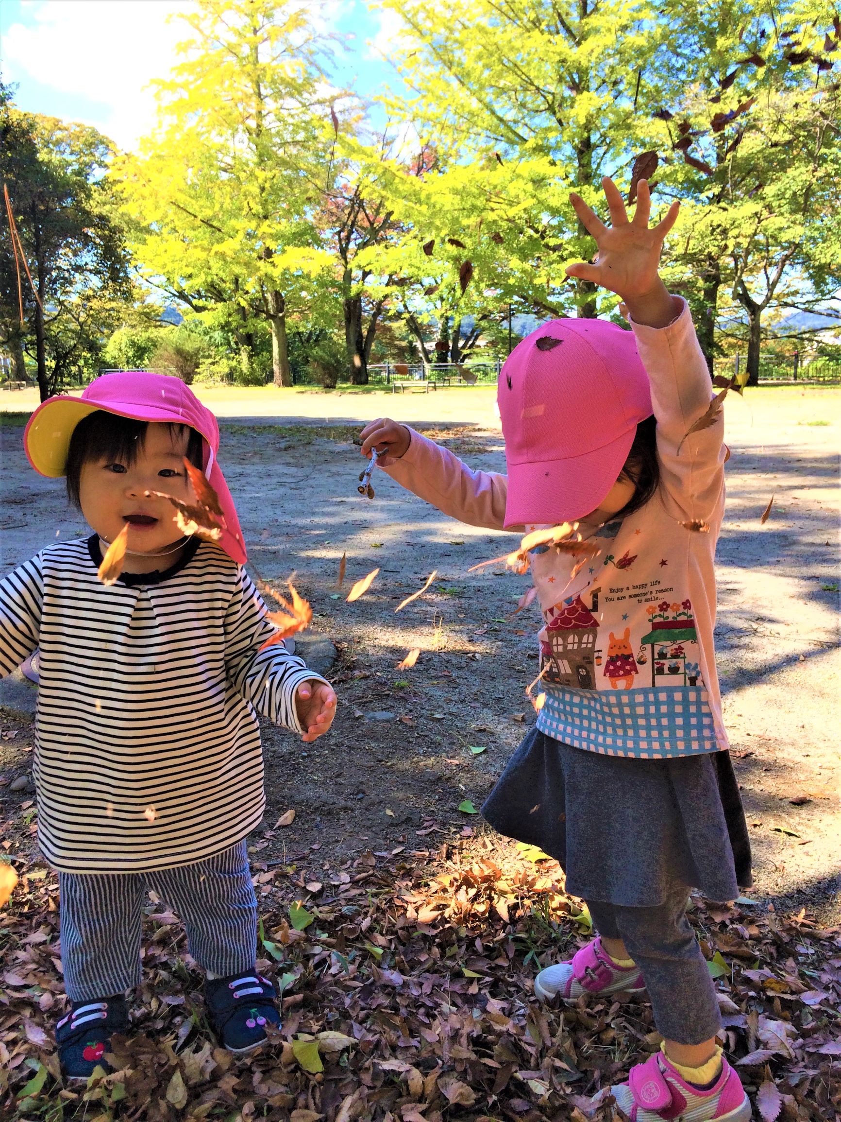 落ち葉や木の枝がたくさんあり拾ったり、パラパラと舞わせてみたりして子ども達は遊んでいました。