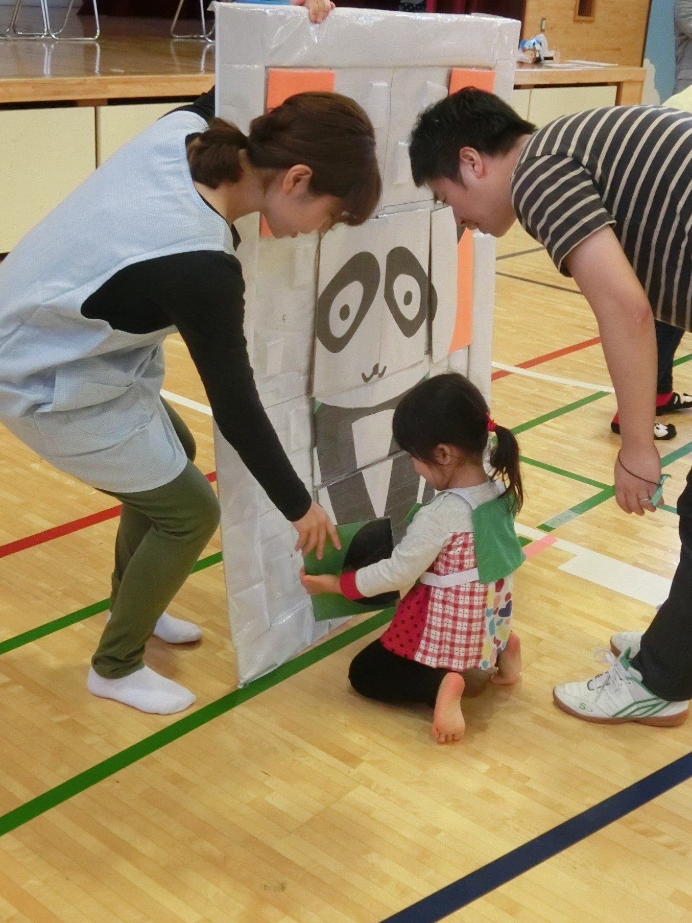 園ごとに1種類の動物の巨大パズルを準備しておき、当日保護者とお子さんが一緒にピースを選び、選んだピースを入れる場所を考えながらはめていくという内容です。