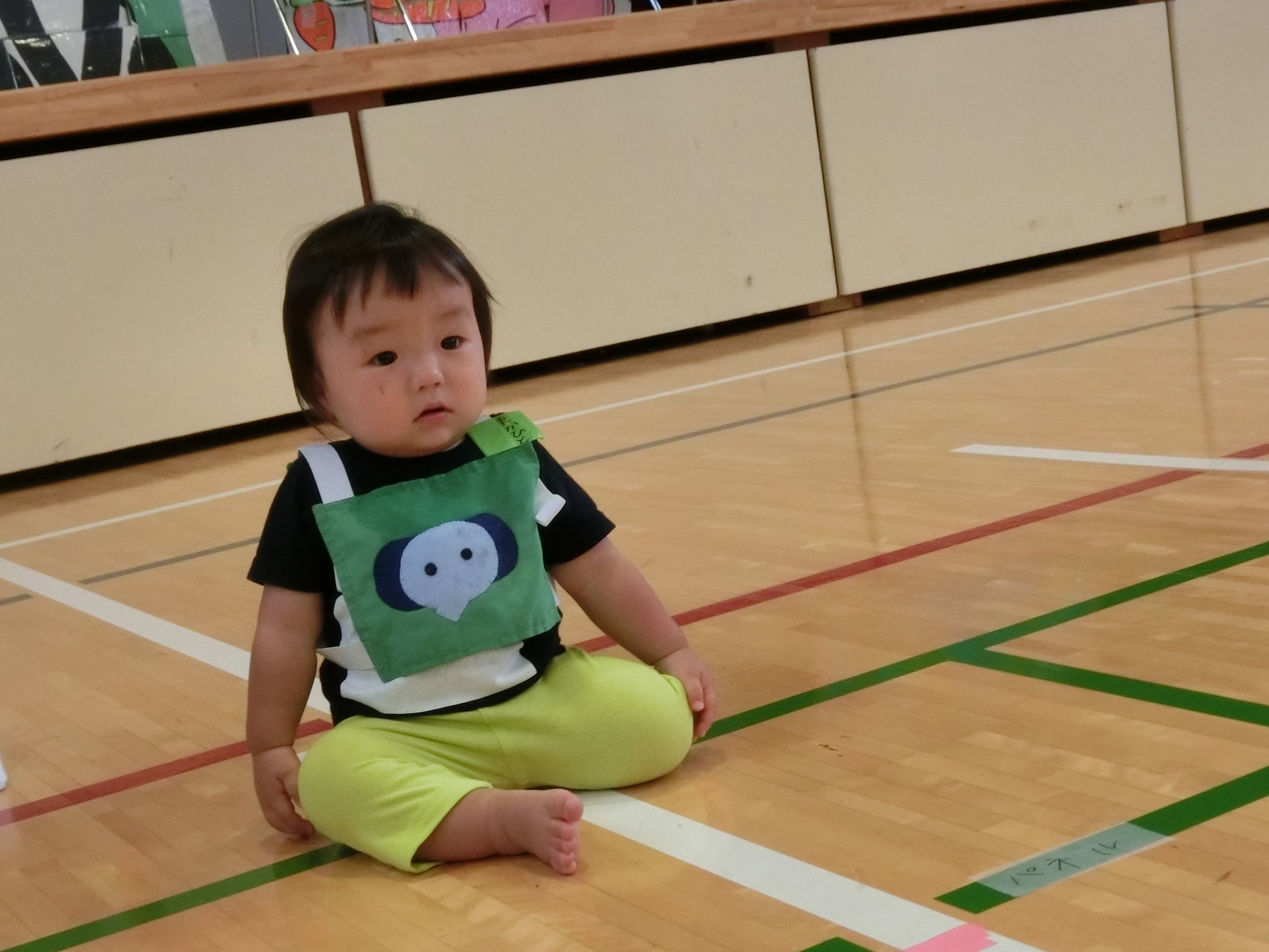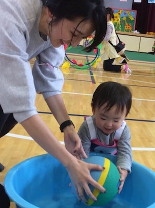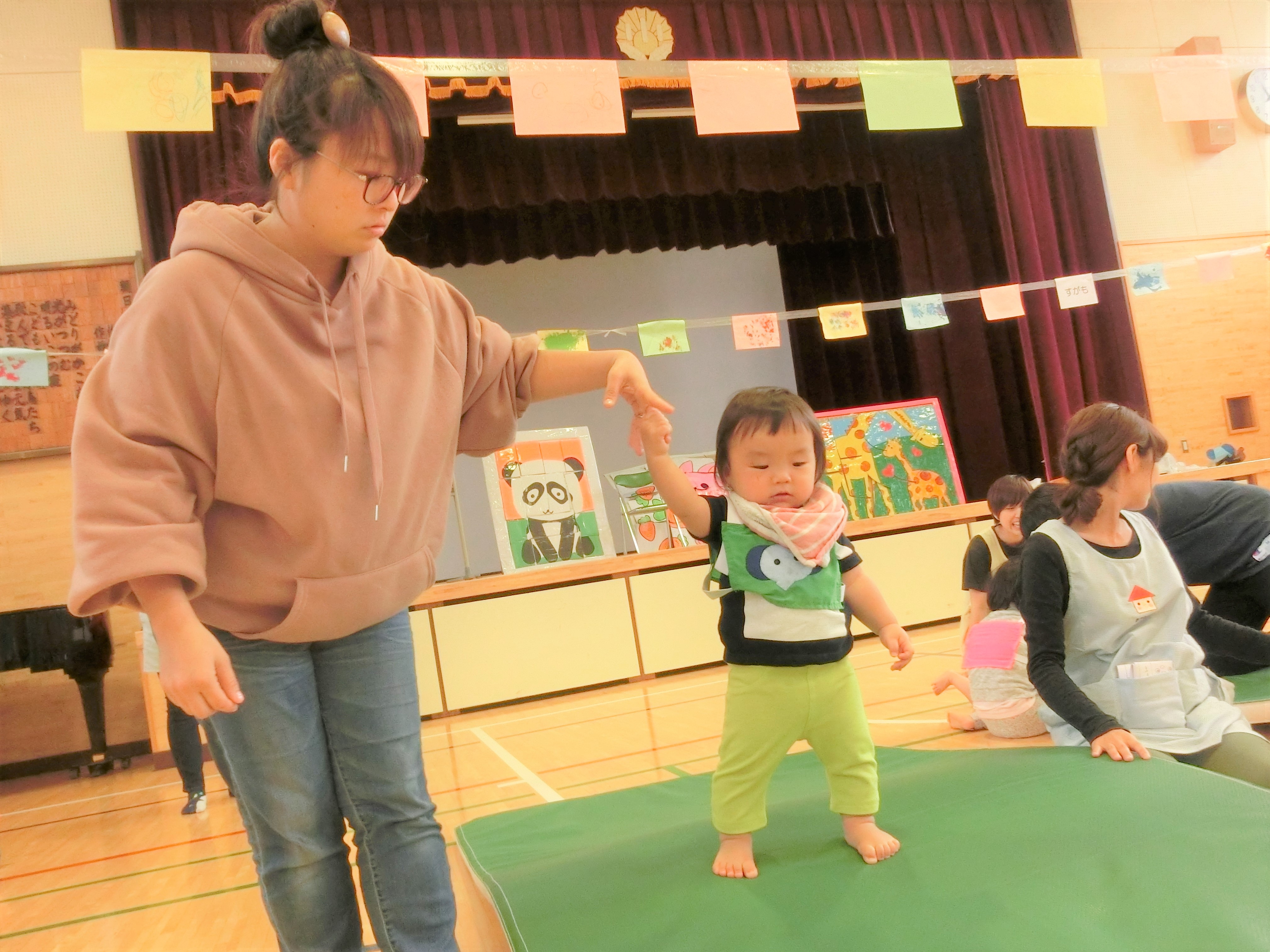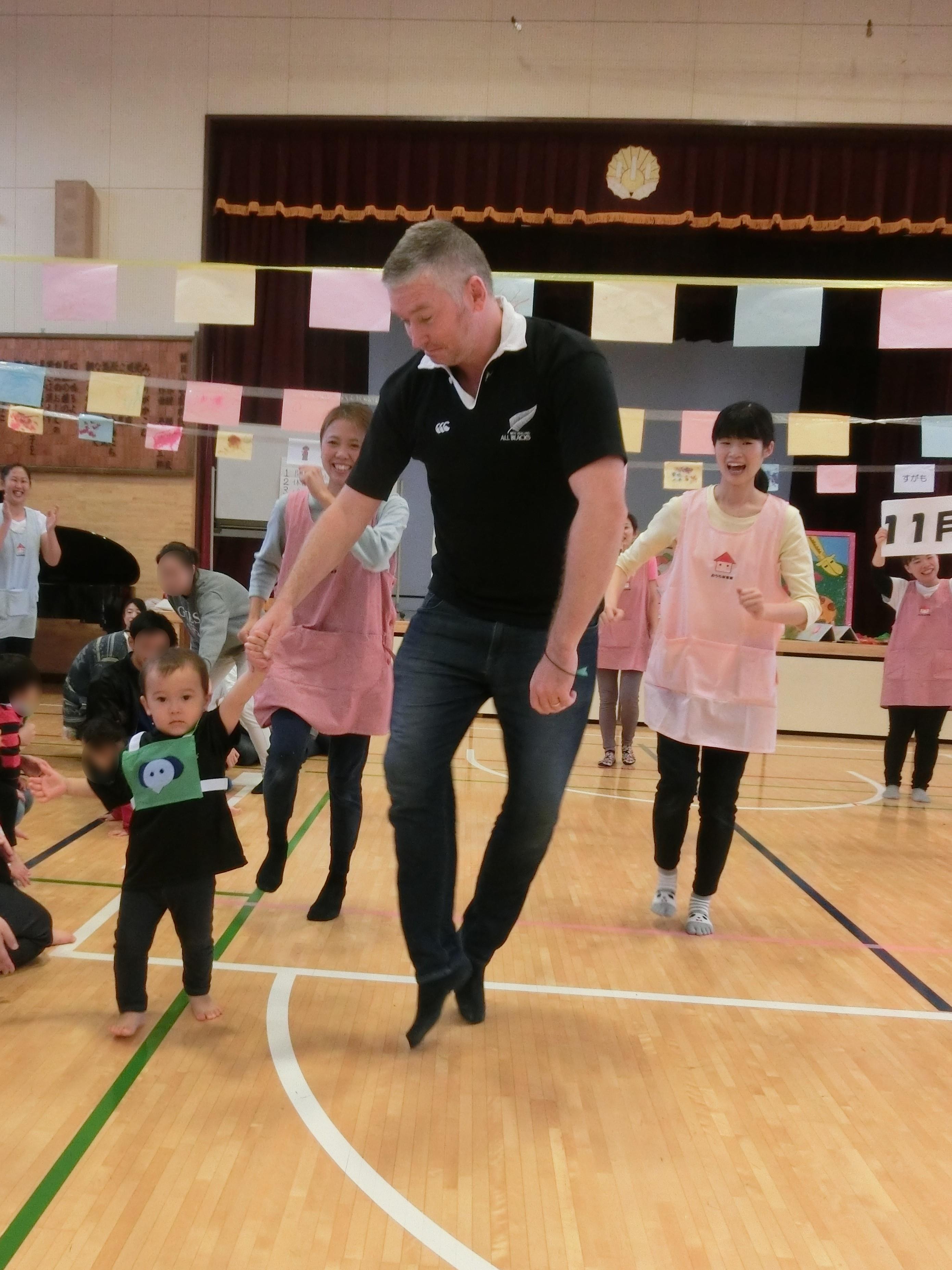 堂々と1人で体を動かす子、恥ずかしくて保護者に抱っこされて出てくる子、保護者がノリノリでスキップしてくださったり・・・と様々でしたが、まわりで見ている方々が手拍子で更に盛り上げてくださり、とても温かい空気を感じることができました。